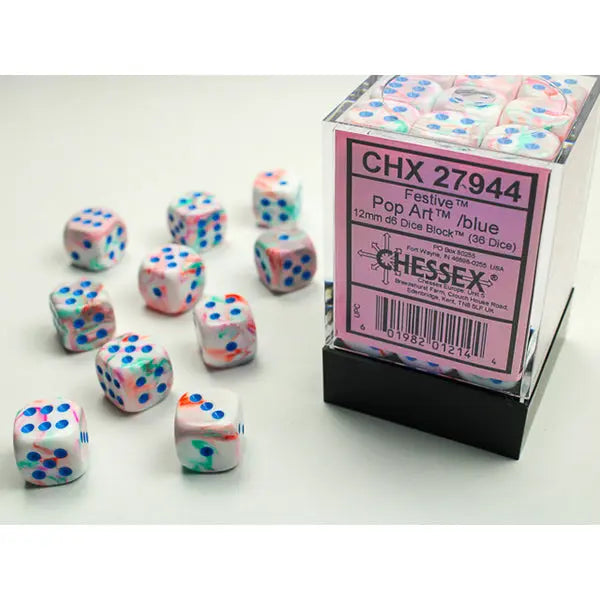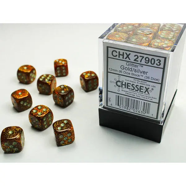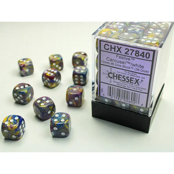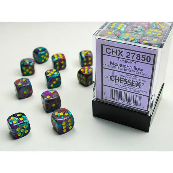 Each set contains 36 12mm d6 dice with Display Case w/Lid and Foam Square
