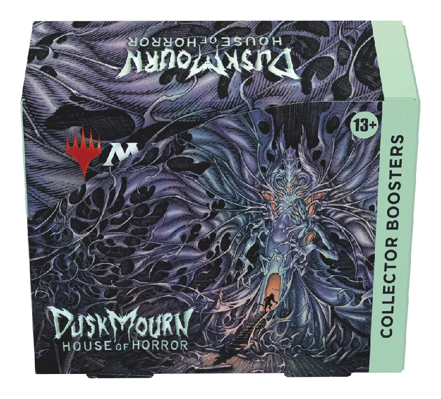 Unlock Duskmourn’s gallery wing and claim the House’s greatest treasures before the House claims you! Each spirit-busting Collector Booster contains Rares and/or Mythics, Traditional Foils, Borderless cards, and Full-Art Lands. In this box you’ll find 12 Duskmourn: House of Horror Collector Boosters, each containing 15 Magic: The Gathering cards and 1 Traditional Foil double-sided token. Every pack contains 5 cards of rarity Rare or higher, 4 Uncommon, 5 Common, and 1 Land cards, with a total of 11–13 Traditional Foil cards.