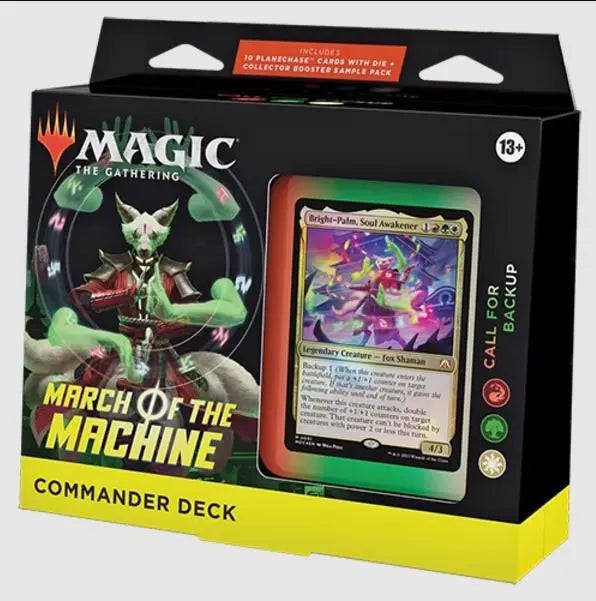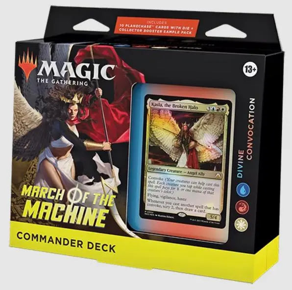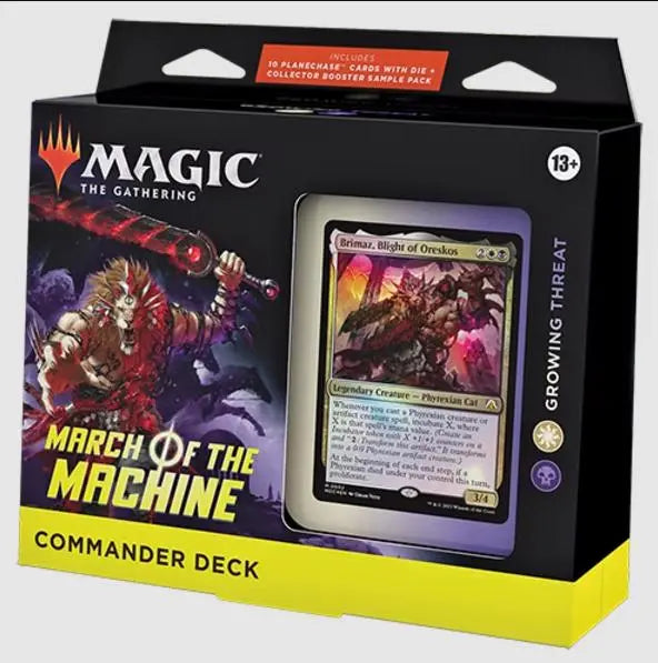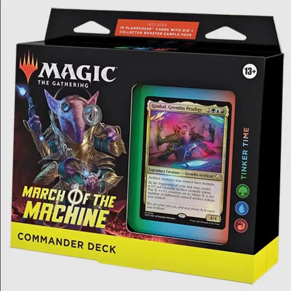 This March of the Machine Commander Deck set includes 1 ready-to-play deck of 100 Magic cards (2 Traditional Foil Legendary cards, 98 nonfoil cards), 10 specialty cards, a 2-card Collector Booster Sample Pack, 1 Foil-Etched Display Commander (a thick cardstock copy of the commander card with foil etched into the card’s border and art), 10 double-sided tokens, 1 deck box (can hold 100 sleeved cards), 1 Life Wheel, 1 special die, 1 strategy insert, and 1 reference card.