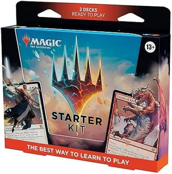 The Lord of the Rings: Tales of Middle-earth Starter Kit contains 2 ready-to-play 60-card decks (Lands included), 4 double-sided tokens (2 with each deck), 2 deck boxes, 1 how-to-play guide booklet, 2 double-sided reference cards (Turn Order/Attacking & Blocking), and 2 code cards for two people to unlock both decks and play online in Magic: The Gathering Arena, a digital platform available on desktop and on the mobile app.