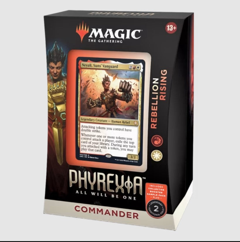 This Phyrexia: All Will Be One Commander Deck set includes 1 ready-to-play deck of 100 Magic cards (2 traditional foil legendary cards, 98 nonfoil cards), a 2-card Collector Booster Sample Pack, 1 foil-etched Display Commander (a thick cardstock copy of the commander card with foil etched into the card’s border and art), 10 double-sided tokens, 1 deck box (can hold 100 sleeved cards), 1 Life Wheel, 1 strategy insert, and 1 reference card.